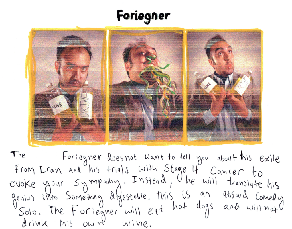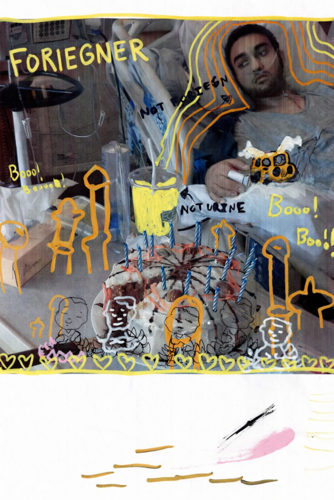 another photo of sohrab in the hospital drawn on, snakes coming out of his head, he says comic book style "Im The Most Spiritual Cancer Survivor In This Hospital!!!"
